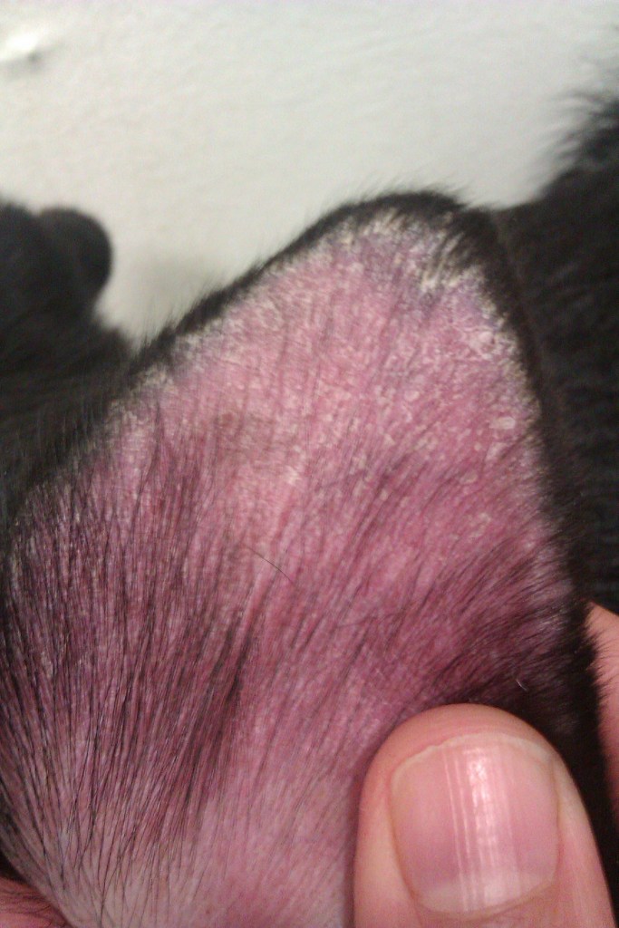 As fotos mostram algumas lesões nos ouvidos típicas no início da doença, e a inflamação que pode ocorrer na superfície (e interior) do olho.